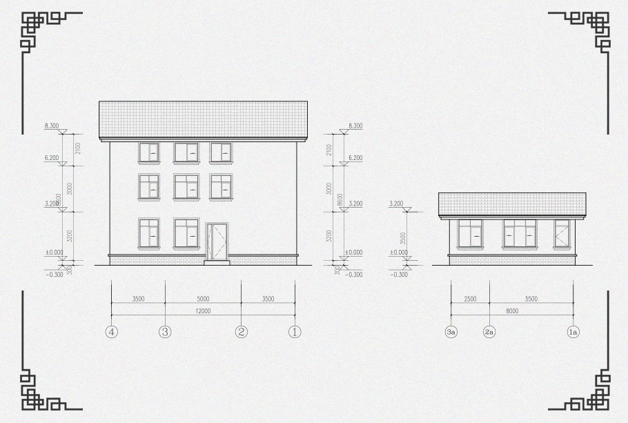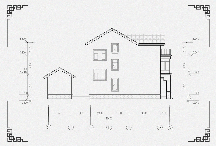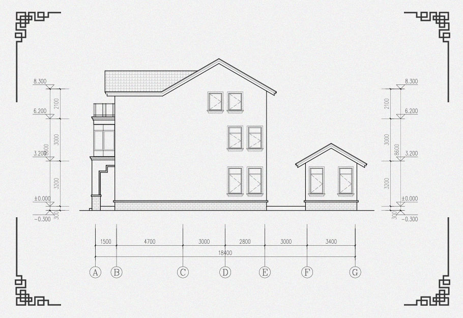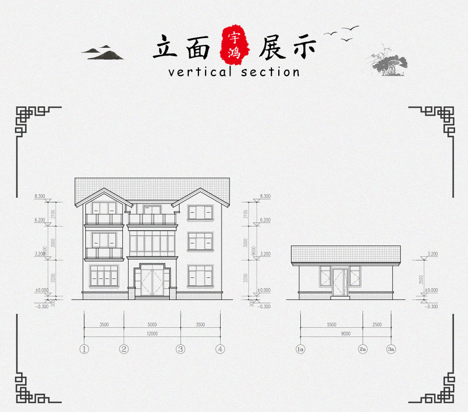 建筑立面圖:東立面圖,西立面圖,南立面圖,北立面圖,剖面圖;