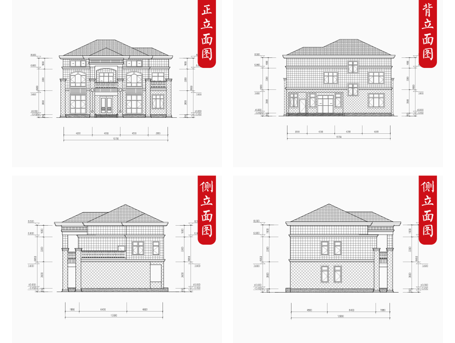 建筑立面圖:東立面圖,西立面圖,南立面圖,北立面圖,剖面圖;