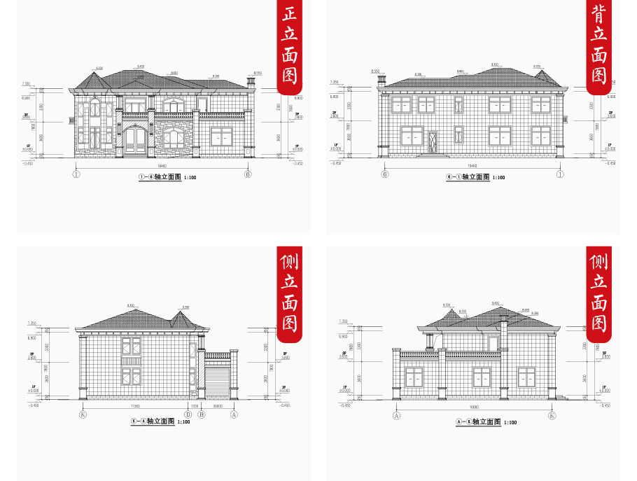 建筑立面圖:東立面圖,西立面圖,南立面圖,北立面圖,剖面圖;