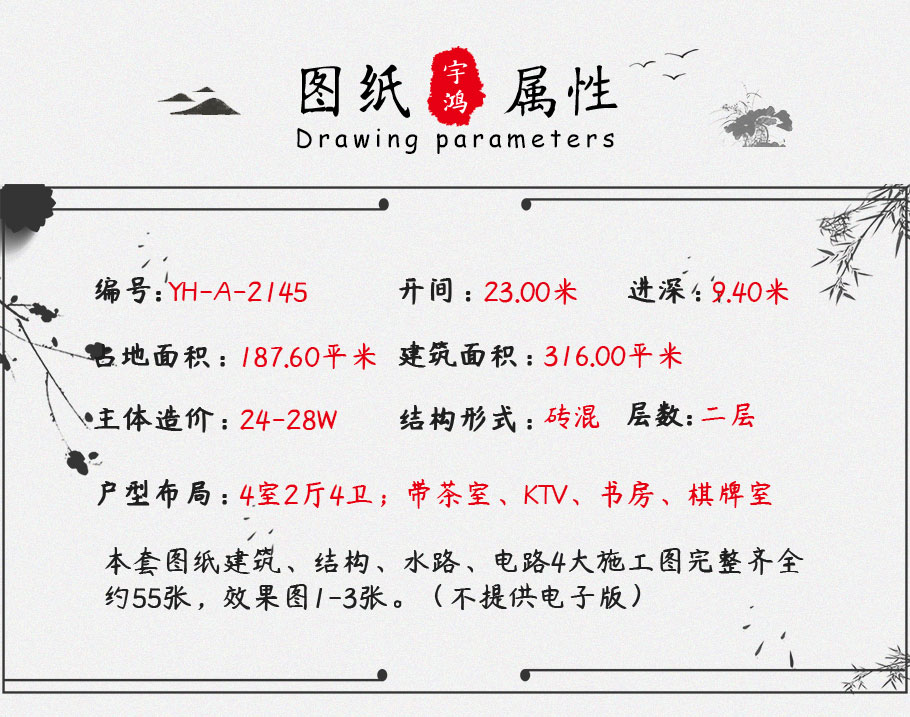 | 風格:中式 | 層數:二層 | 結構形式:磚混結構 | 圖紙編號:YH-A-2145 |