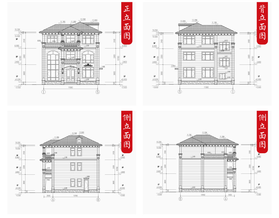 建筑圖: | 建筑平面圖:一層平面圖,二層平面圖,三層平面圖; 建筑立面圖:東立面圖,西立面圖,南立面圖,北立面圖,剖面圖; 大樣圖:樓梯詳圖,細部大樣,門窗大樣 |