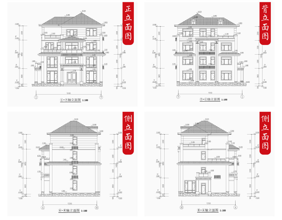 建筑立面圖:東立面圖,西立面圖,南立面圖,北立面圖,剖面圖;