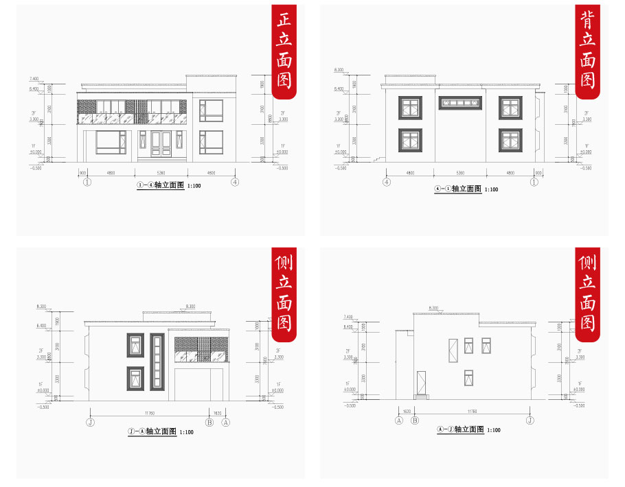建筑立面圖:東立面圖,西立面圖,南立面圖,北立面圖,剖面圖;