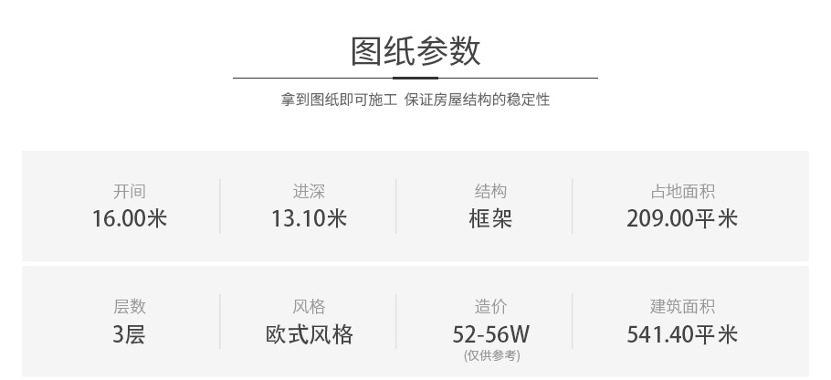 開間:16米 | 進深:13.1米 | 占地面積:209平方米 | 建筑面積:541.4平方米 |