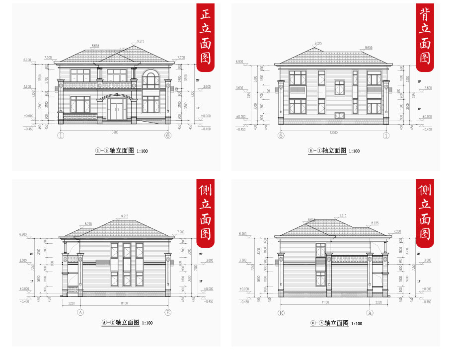建筑立面圖:東立面圖,西立面圖,南立面圖,北立面圖,剖面圖;