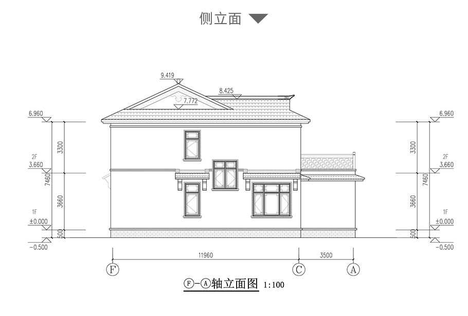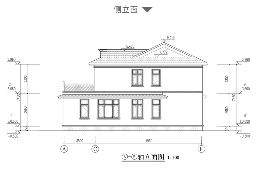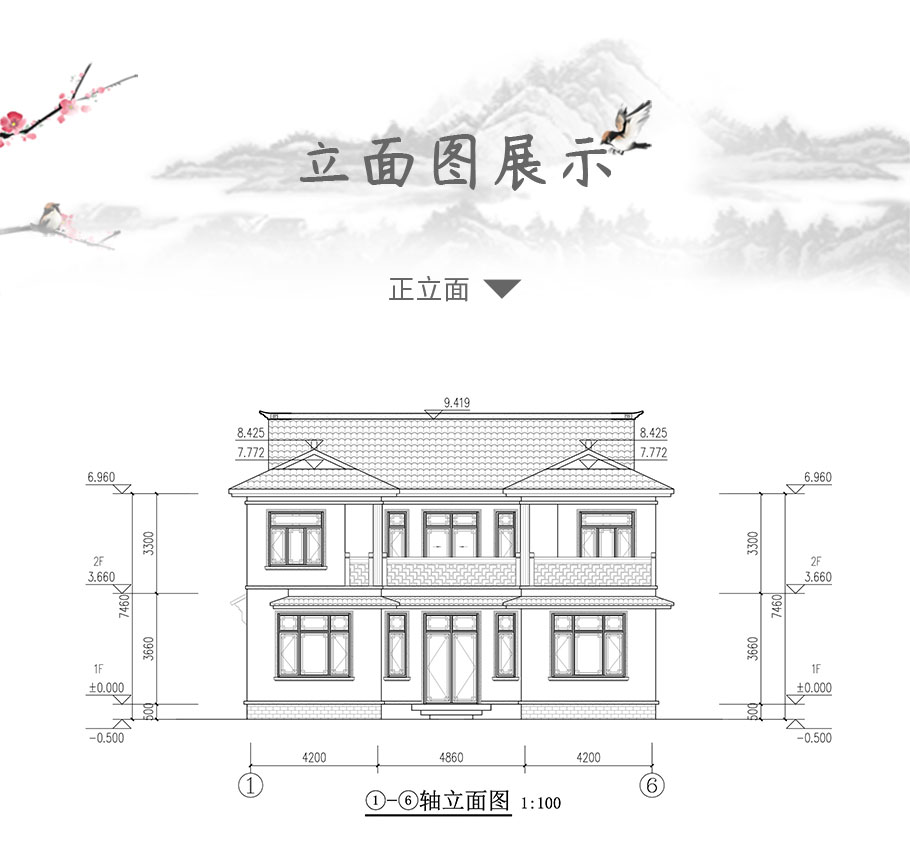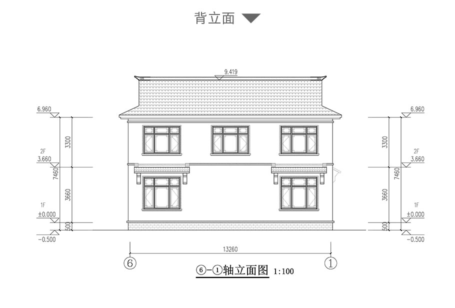 建筑立面圖:東立面圖,西立面圖,南立面圖,北立面圖,剖面圖;