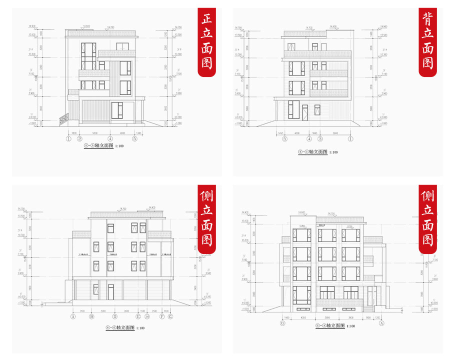 建筑圖: 建筑平面圖:一層平面圖,二層平面圖,三層平面圖; 建筑立面圖:東立面圖,西立面圖,南立面圖,北立面圖,剖面圖; 大樣圖:樓梯詳圖,細部大樣,門窗大樣
