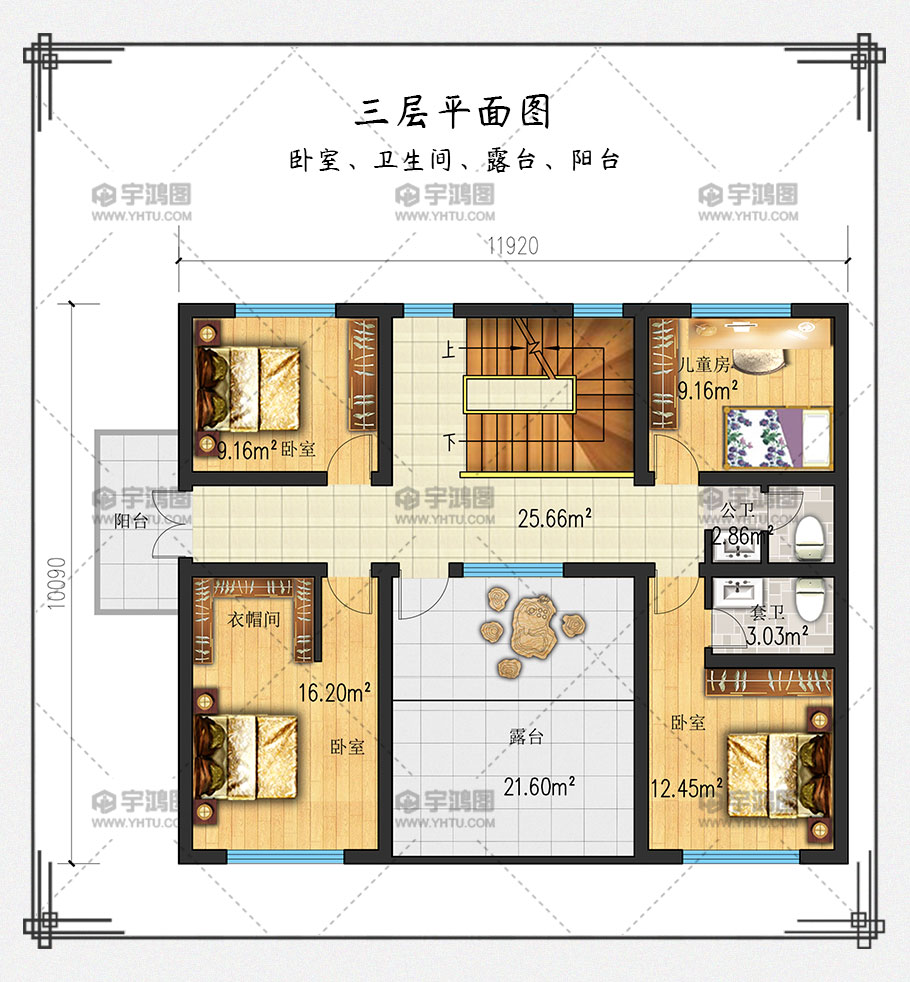 戶型為12x10米四層中式農村別墅設計圖紙,豪華大氣帶堂屋,戶型設計精美闊氣,一二三層設有落地大窗,二三層四層分別有陽臺、大露臺,采光充足,室內敞亮。外立面色彩搭配富有質感,室內功能齊全,空間劃分合理,房間尺寸適宜,空間利用率高。