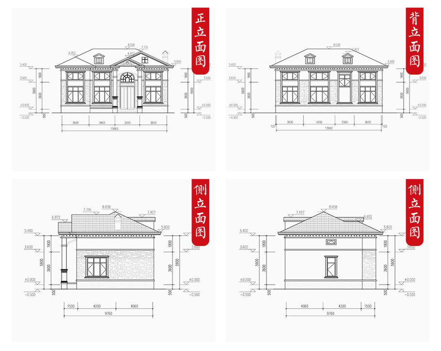 建筑圖: | 建筑平面圖:一層平面圖,二層平面圖; 建筑立面圖:東立面圖,西立面圖,南立面圖,北立面圖,剖面圖; 大樣圖:樓梯詳圖,細部大樣,門窗大樣 |