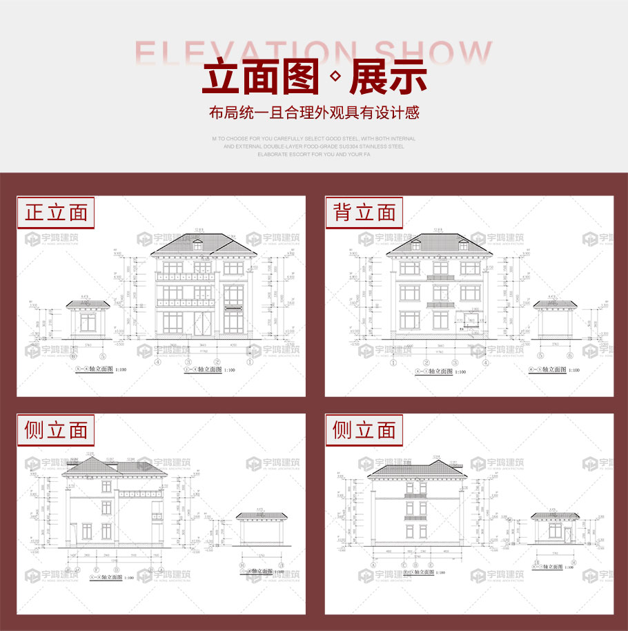 | 建筑圖: | 建筑平面圖:一層平面圖,二層平面圖,三層平面圖; 建筑立面圖:東立面圖,西立面圖,南立面圖,北立面圖,剖面圖; 大樣圖:樓梯詳圖,細(xì)部大樣,門窗大樣 |