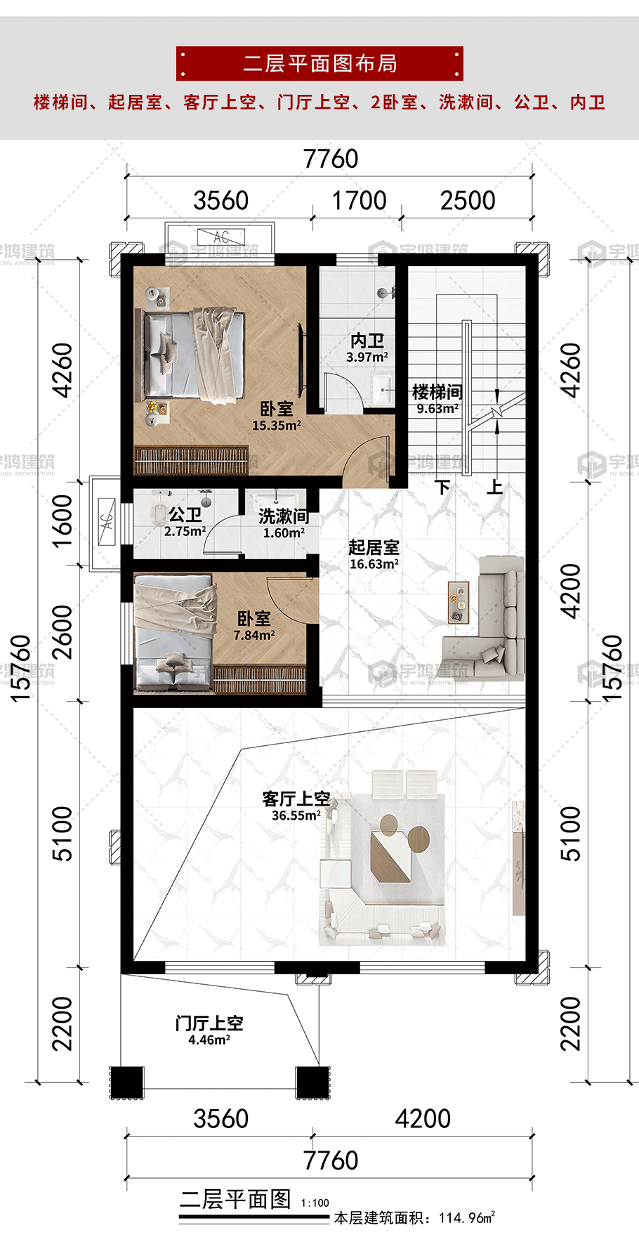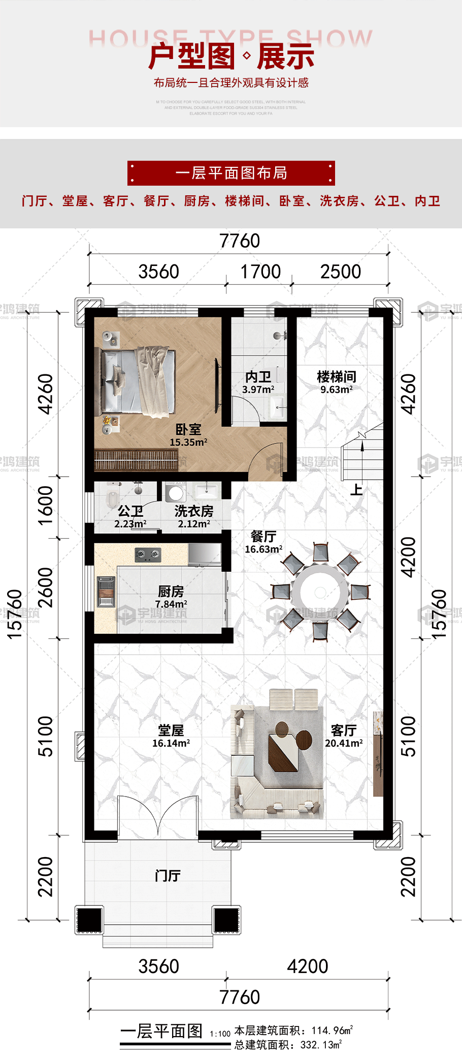 | 開(kāi)間:7.76米 | 進(jìn)深:15.76米 | 占地面積:119.2平方米 | 建筑面積:332.13平方米 |
