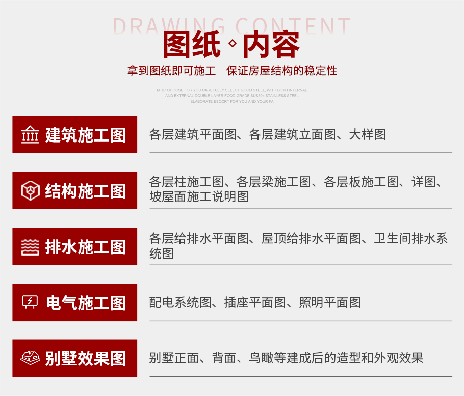| 建筑圖: | 建筑平面圖:一層平面圖,二層平面圖,三層平面圖; 建筑立面圖:東立面圖,西立面圖,南立面圖,北立面圖,剖面圖; 大樣圖:樓梯詳圖,細部大樣,門窗大樣 |