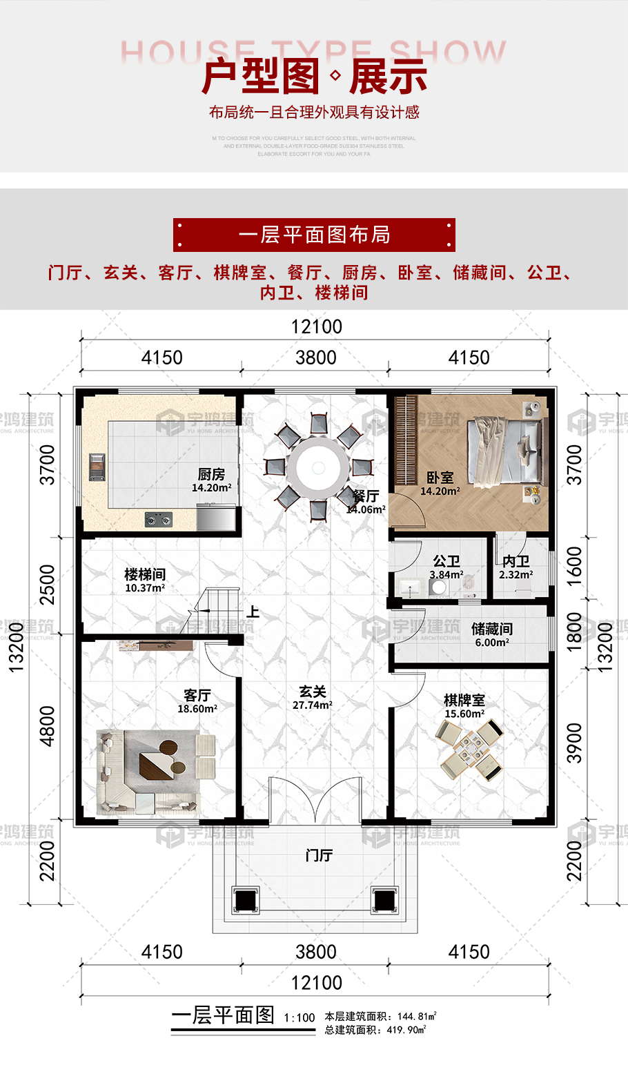 開間:12.1米 | 進深:13.2米 | 占地面積:149.43平方米 | 建筑面積:419.9平方米 |